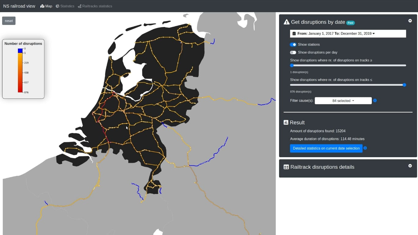 In this project, the aim was to visualize disruptions on the dutch railways. This visualization is done via D3.js connected to the API of the NS. The application also contains a statistics tab with more in-depth information about each track.